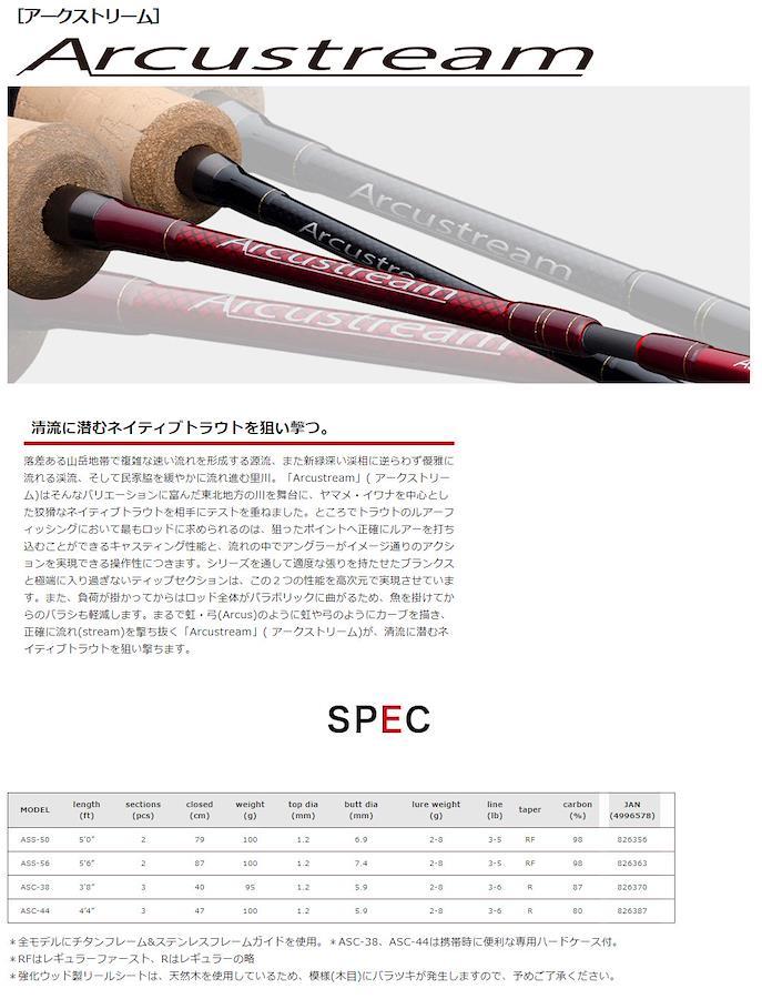 落差ある山岳地帯で複雑な速い流れを形成する源流、また新緑深い渓相に逆らわず優雅に流れる渓流、そして民家脇を緩やかに流れ進む里川。「Arcustream」( アークストリーム)はそんなバリエーションに富んだ東北地方の川を舞台に、ヤマメ・イワナを中心とした狡猾なネイティブトラウトを相手にテストを重ねました。ところでトラウトのルアーフィッシングにおいて最もロッドに求められるのは、狙ったポイントへ正確にルアーを打ち込むことができるキャスティング性能と、流れの中でアングラーがイメージ通りのアクションを実現できる操作性につきます。シリーズを通して適度な張りを持たせたブランクスと極端に入り過ぎないティップセクションは、この2つの性能を高次元で実現させています。また、負荷が掛かってからはロッド全体がパラボリックに曲がるため、魚を掛けてからのバラシも軽減します。まるで虹・弓(Arcus)のように虹や弓のようにカーブを描き、正確に流れ(stream)を撃ち抜く「Arcustream」( アークストリーム)が、清流に潜むネイティブトラウトを狙い撃ちます。