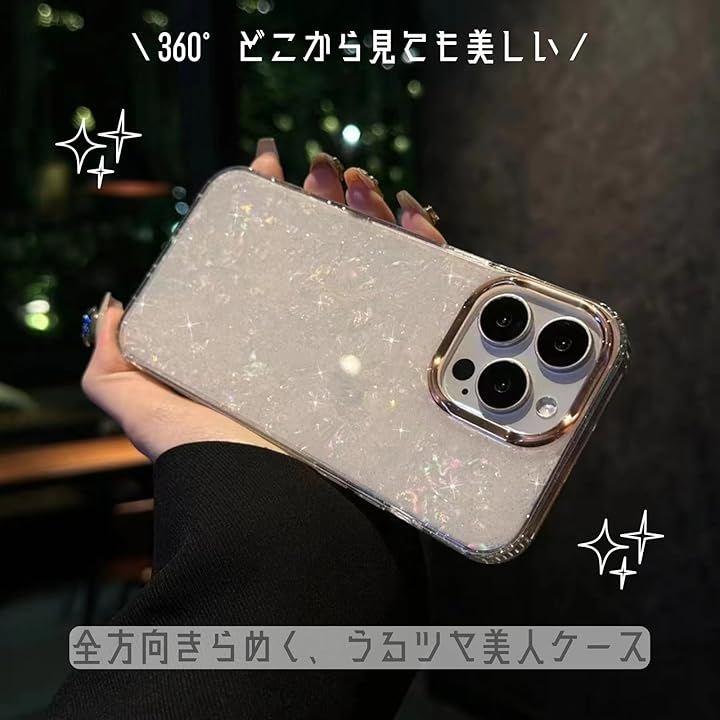 「上品さ溢れるキラキラ感」 ケース全体に散りばめられた大小異なるラメが、まるで宝石のように様々な輝きを放ち、iPhoneを華やかに彩ります。