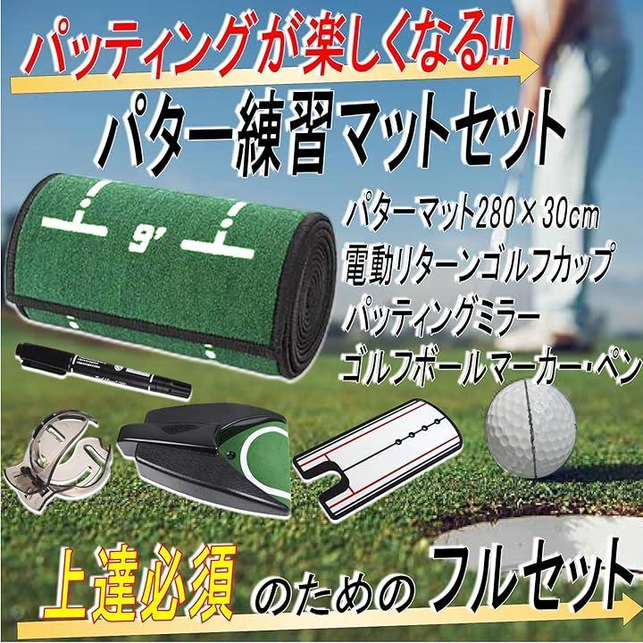 「製品情報」パター練習マットセット セット内容:パターマット 280cmx30cm 電動リターンゴルフカップ(電池別売り) 16cmx27cmx6cm パッティングミラー 31cmx15cm ゴルフボールマーカー・ペン *モニターの環境等により、色の見え方に若干差が生じる場合がございます。