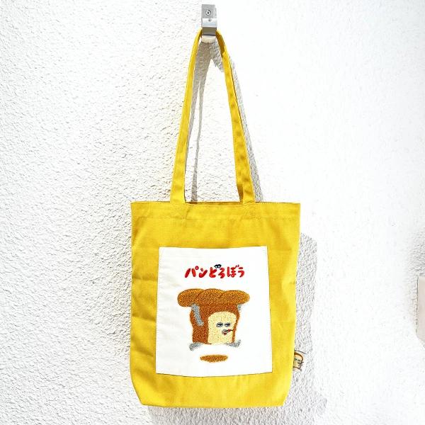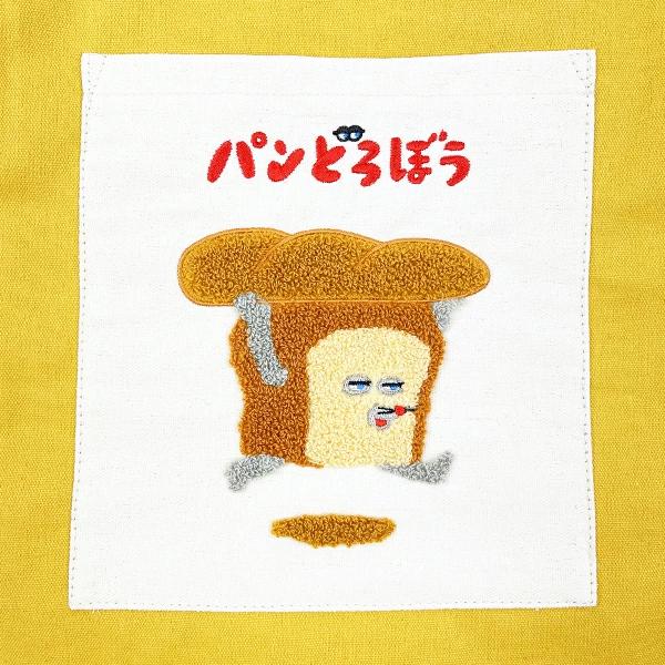 可愛いパンどろぼうのイラスト部分はサガラ織りで味のあるデザインになっています♪こちらはいとしのパンのデザインです。