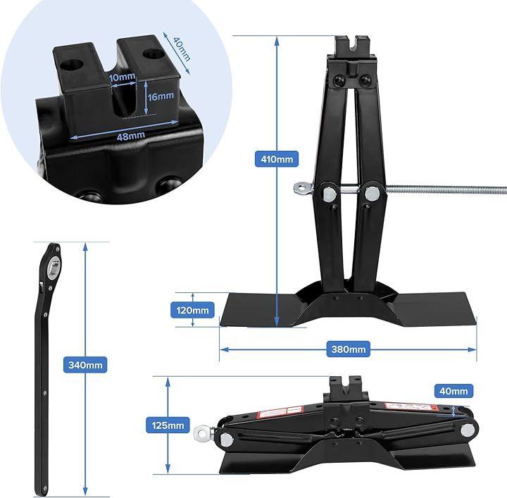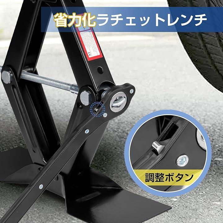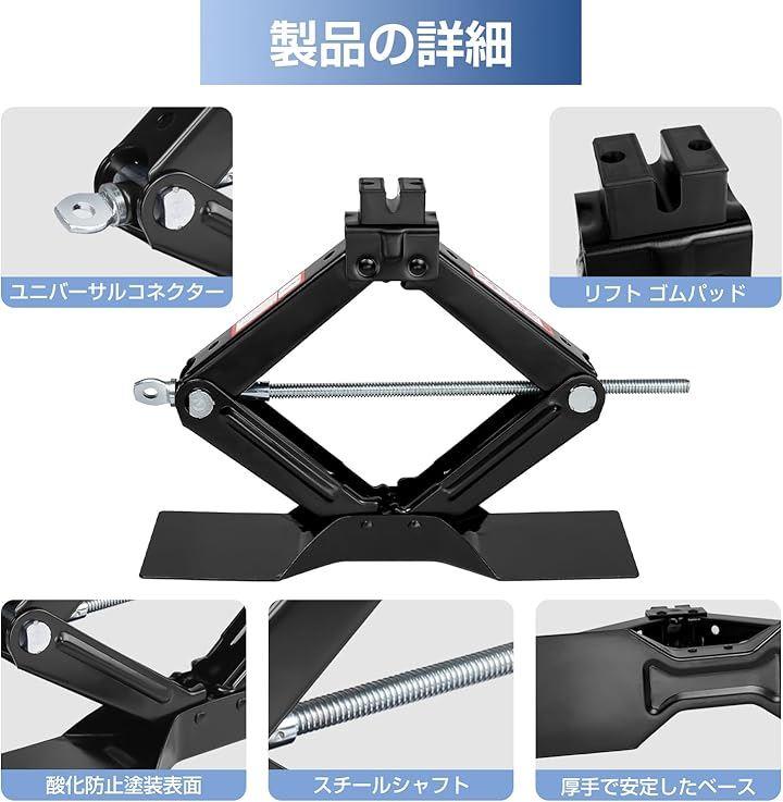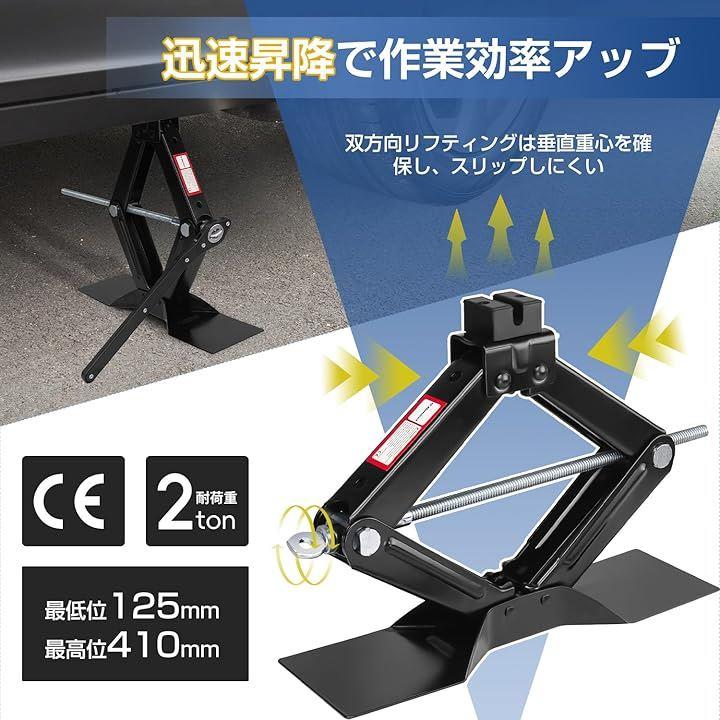 「商品仕様」商品内容:シザーリフトジャックx 1;拡張ラチェットレンチx 1;カラー:ブラック;最大耐荷重:2トン(4409ポンド);作業高さ:125mm - 410mm;正味重量:3.3kg;CE基準に適合している安全性が高い製品であり。