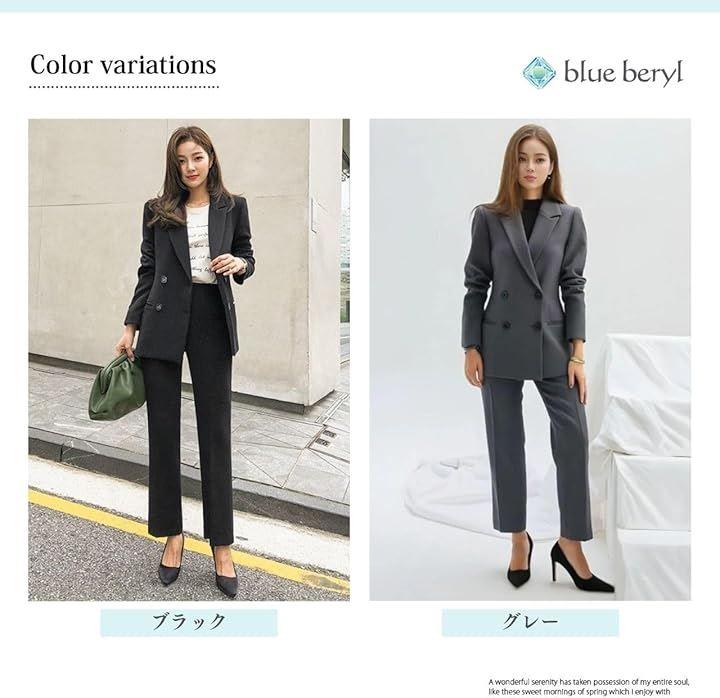 「モダンなスタイルと快適素材」 ダブルブレステッドジャケットとストレートパンツの組み合わせが、スマートでモダンなシルエットを実現。