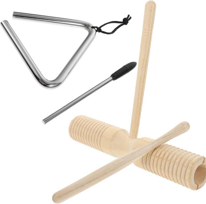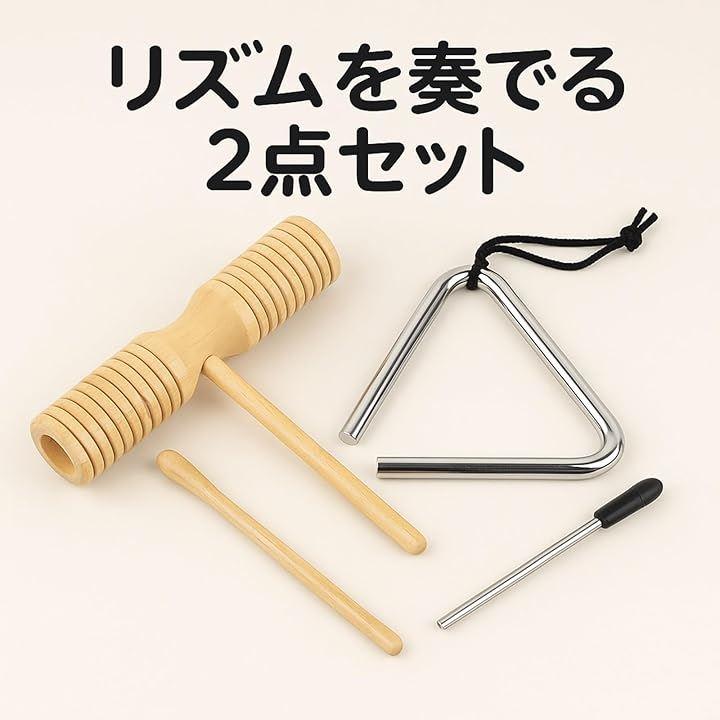 ウッドブロック、ギロ、トライアングルを組み合わせたパーカッションセット2点セットです。