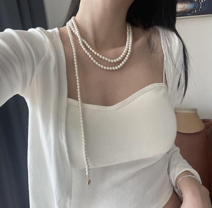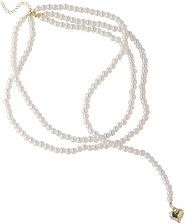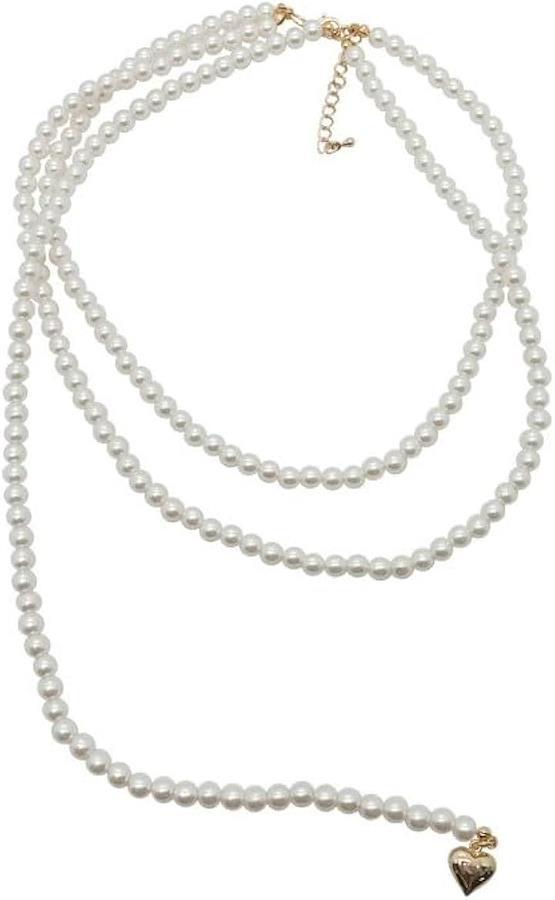 「デザイン」人気の二連パールネックレスに垂れ下がりのパールチェーン付き / 先端にはゴールドのハートチャーム付