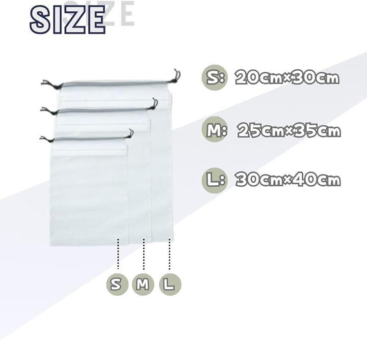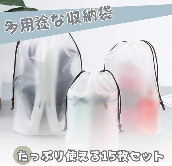 「商品内容」巾着袋(SMLサイズ各5枚x3セット)、寸法:S 20cmx30cm、M 25cmx35cm、L 30cmx40cm 材質:EVA *サイズ詳細は商品画像をご確認ください