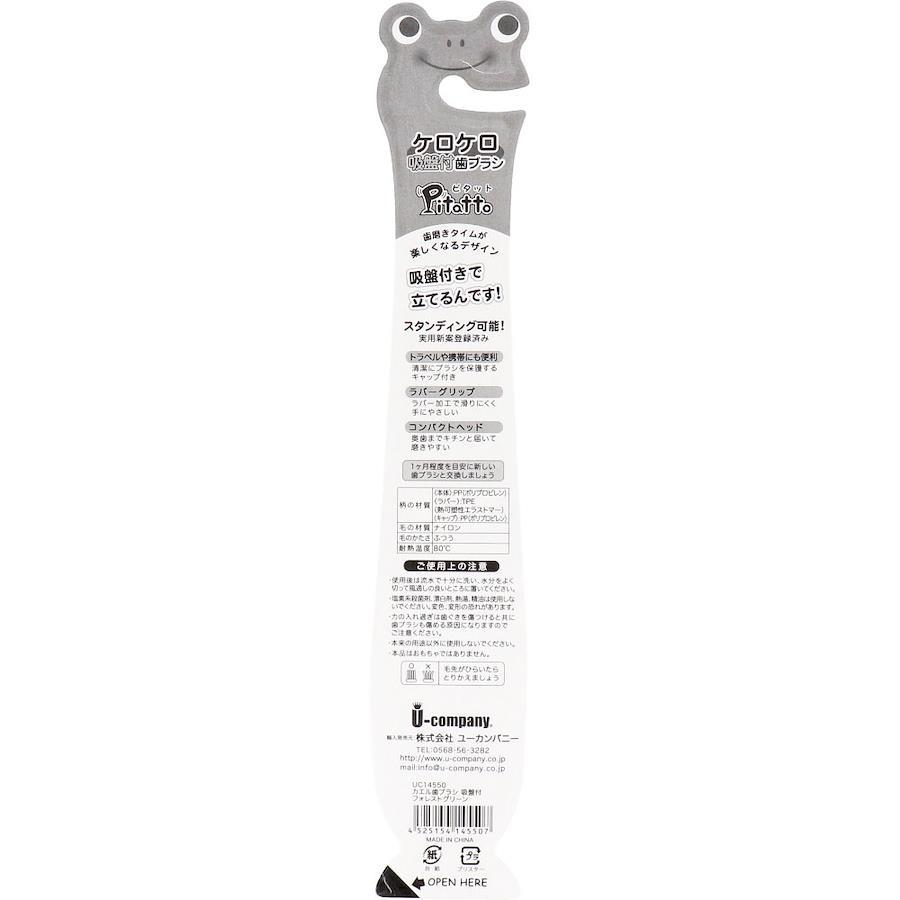 足の吸盤がぴたっとくっつく衛生的でかわいいカエルの歯ブラシです。●かわいいデザインなのでお子様や女性へオススメの歯ブラシです。●便利なキャップ付き。●くっついて倒れないので、洗面台の場所をとりません。●ラバー加工で滑りにくく手にやさしいハンドル。●奥歯までキチンと届いて磨きやすいコンパクトヘッド。●色:フォレストグリーン。
