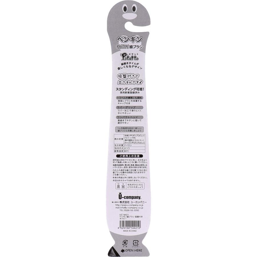 足の吸盤がぴたっとくっつく衛生的でかわいいペンギンの歯ブラシです。●かわいいデザインなのでお子様や女性へオススメの歯ブラシです。●便利なキャップ付き。●くっついて倒れないので、洗面台の場所をとりません。●ラバー加工で滑りにくく手にやさしいハンドル。●奥歯までキチンと届いて磨きやすいコンパクトヘッド。●色:ネイビー。