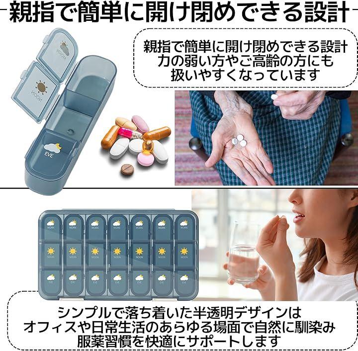 「1週間分をしっかり管理、飲み忘れ防止」 7つの独立ケースで1週間分の薬を曜日ごとに分けて収納でき、毎日の服薬を簡単に管理できます。