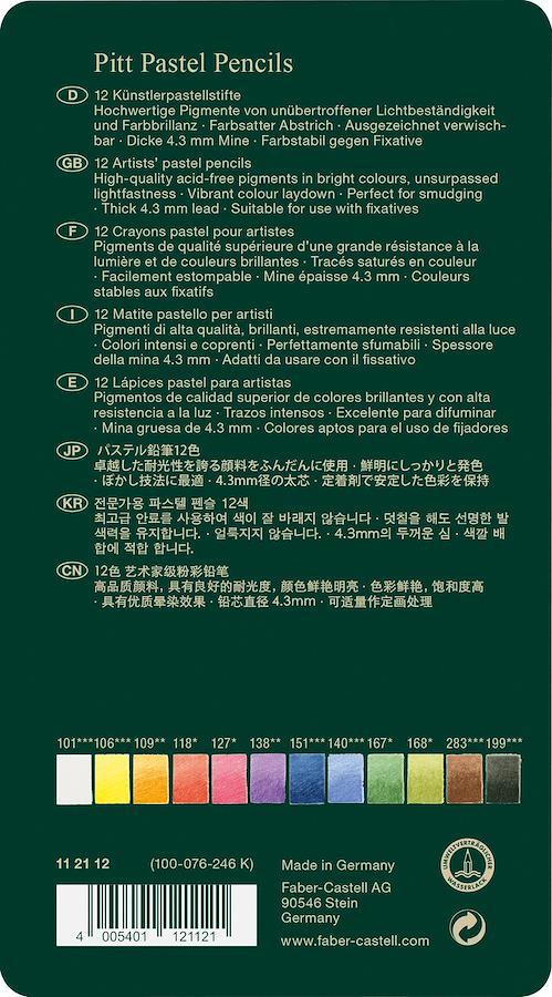 ピットパステル鉛筆は、手を汚すことなくパステル画が描ける、ナチュラル軸の鉛筆型パステルです。高品質顔料を使用したミディアム芯は耐光性に優れ、細部の描き込みや線だけで描くデッサン画に適しています。また、指や擦筆などでぼかすことにより独自のニュアンスを生み出すことができます。下書きや重ね塗り時に使用したり、ポリクロモスパステル使用時にピットパステル鉛筆で細部の描き込みや繊細なタッチを加えることで、パステル画の表現の幅が広がります。