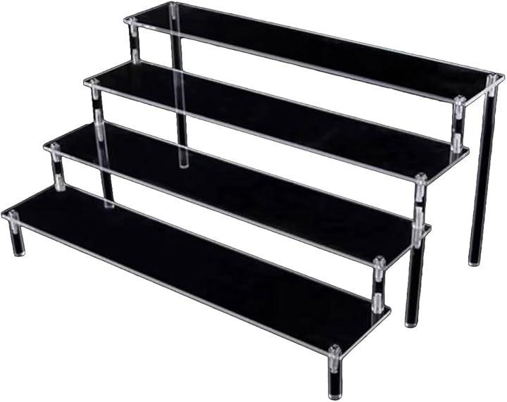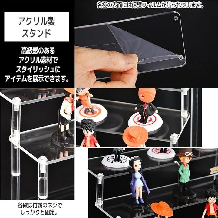 「素材」アクリル「カラー」クリア「サイズ」3段30cm幅:幅30cmx奥行19cmx高14.8cm、3段40cm幅:幅40cmx奥行19cmx高14.8cm、4段30cm幅:幅30cmx奥行25cmx高19.5cm、 4段40cm幅:幅40cmx奥行25cmx高19.5cm、5段30cm幅:幅30cmx奥行32cmx高25cm、5段40cm幅:幅40cmx奥行32cmx高25cm 共通サイズ:台幅8cm「重量」3段30cm幅:350g、3段40cm幅:400g、4段30cm幅:550g、4段40cm幅:650g、5段30cm幅:850g、5段40cm幅:980g「補足」各アクリル表面には保護フィルムが貼られており、剥がすと透明になります。