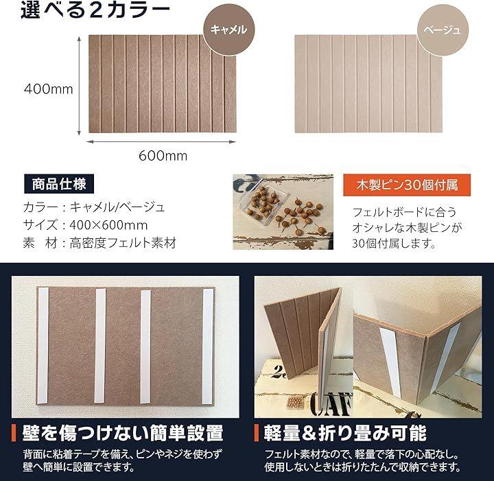 フェルトボード 400x600mmは、届いてすぐに使えるおしゃれな木製の押しピン付き&粘着テープ付きの掲示板です。