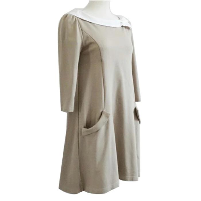 【管理番号】003064【商品名】 FOXEY/フォクシー【アイテム】 Valuableバックフレアーミニ襟付き【サイズ】 38(肩幅/約38cm 身幅/約41cm 袖丈/約41cm 着丈/約78cm)【色・素材】 本体:ベージュ 襟:白・ワンピース(表地:レーヨン66% ナイロン31% ポリウレタン3% 裏地:ポリエステル100%) 襟(表地:綿79% ナイロン18% ポリウレタン3%)【付属品】 襟ボタン【外観ランク】 Aランク【商品補足説明】 襟の商品タグが付いています。