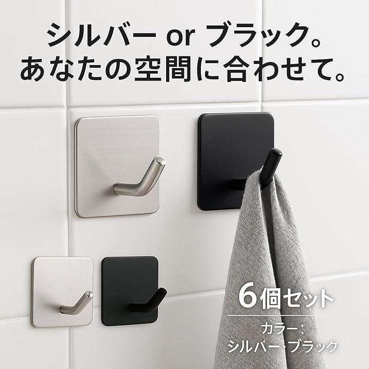 バスルームやキッチン、玄関など多くの場所でお使いいただける壁面フック6個セットです。