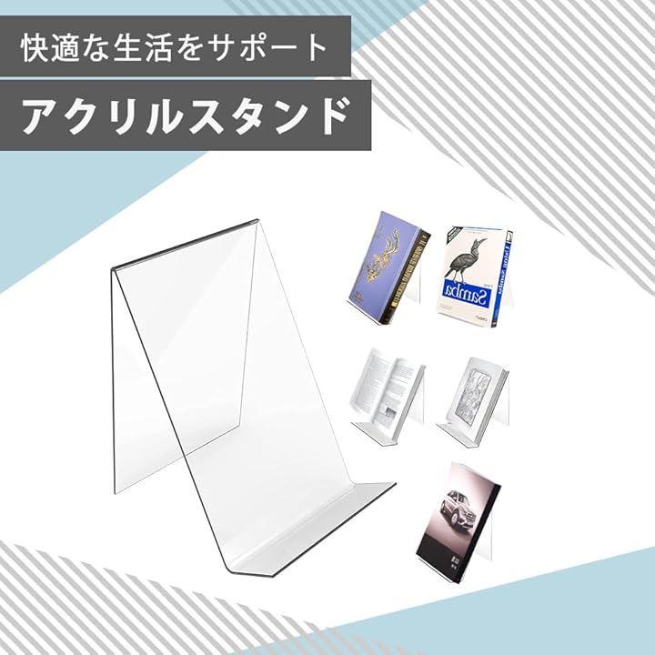 「商品詳細」 セット内容:ブックスタンド(6枚セット) 素材:アクリル板(クリア) サイズ:画像参照 用途:本立て、卓上整理、アクリルスタンド、レコードスタンド、ディスプレイ用途 カラー:透明(クリア)