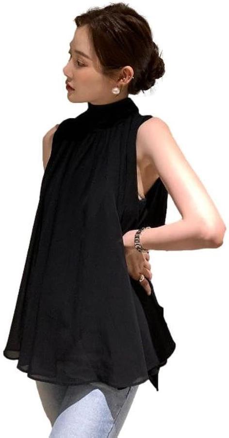 スタンドカラーとすっきりとしたノースリーブが、スタイルにシャープさをプラスして。
