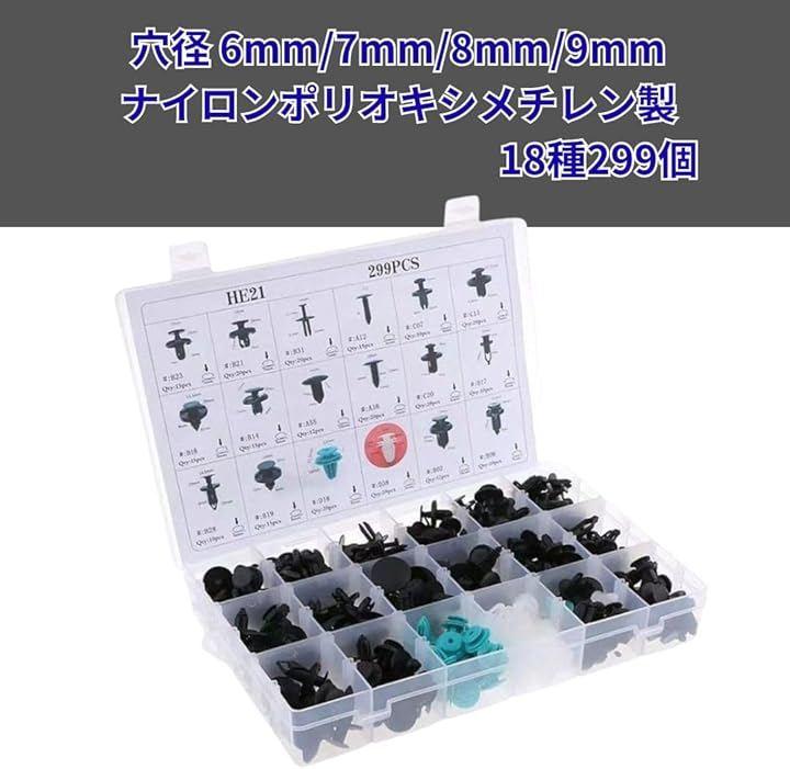 「商品詳細」BOXサイズ:27.5x18x4.5cm、内容量:299個、種類:18種類、素材:プラスチック・ナイロン