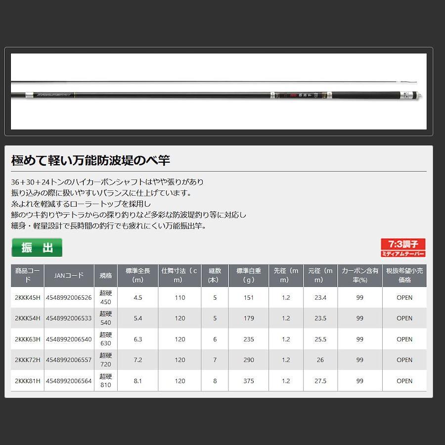 商品コード:2KKK45H●規格:超硬450標準全長:4.5m●仕舞寸法:110cm●継数:5本標準自重:151g先径:1.2mm●元径:23.4mmカーボン含有率:99%