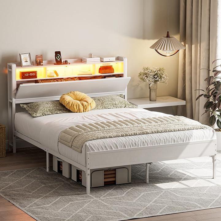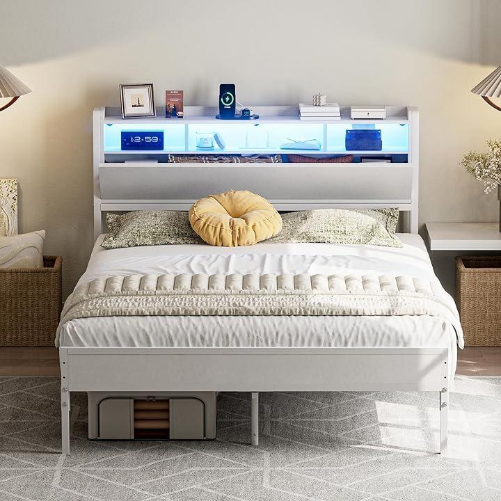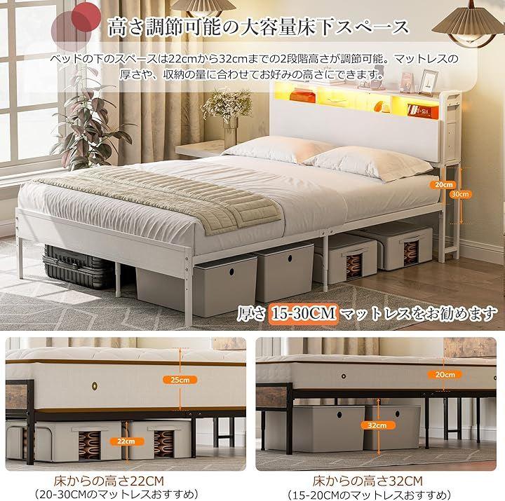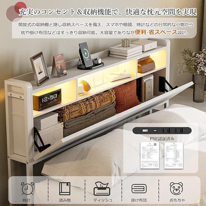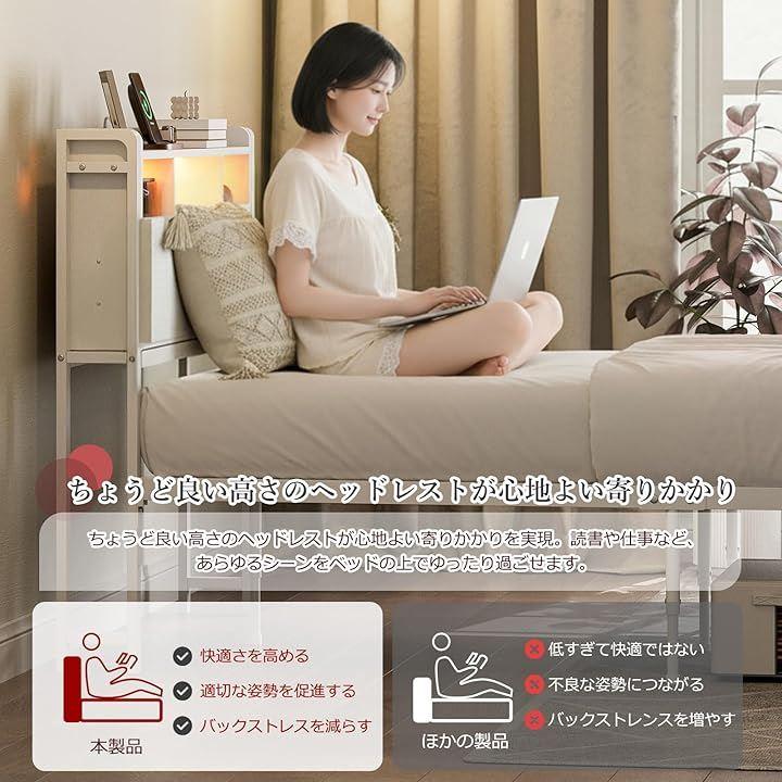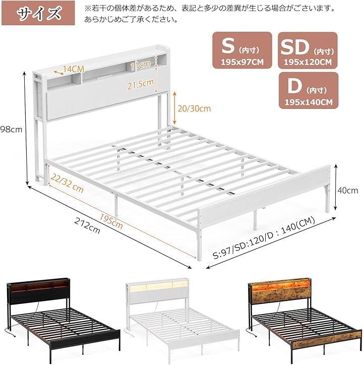 IKIFLY ベッドフレーム シングル 収納宮棚付き パイプベッド コンセント付き シングルベッド スチールベッド LEDライト付き 2段階高さ調整 頑丈 カビ防止 安定性 耐久性 耐荷重350KG 組立簡単 (幅97x奥行212x高さ98cm,S ホワイト)