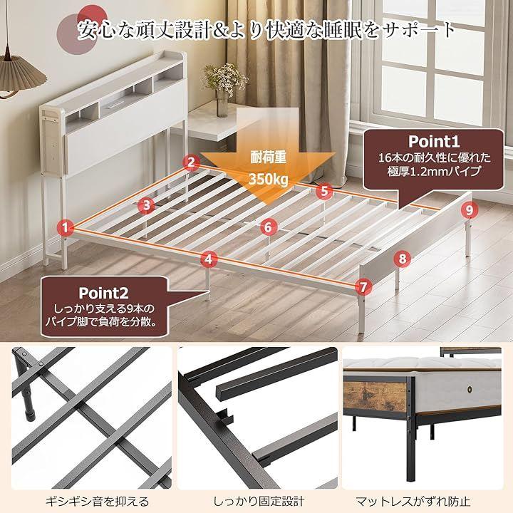 「350kgの耐荷重。 圧倒的な耐久性と驚異の安定感」ベッドフレームは16本の高強度スチール製フレームと9本の太く頑丈なサポート脚を組み合わせた構造に加え、接合部の金具一つひとつまで強化を追求。