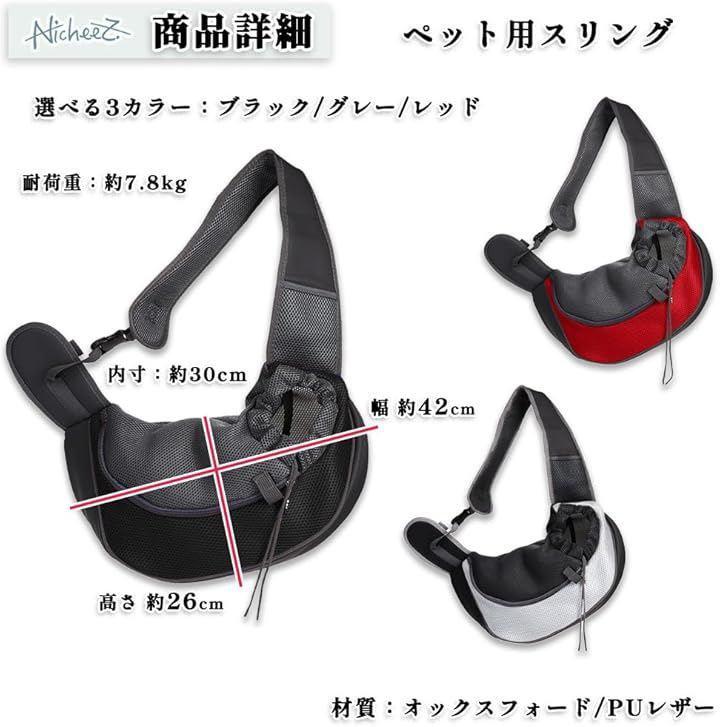 「商品内容」 ペット用スリング 材質:オックスフォード/PUレザー カラー:ブラック/グレー/レッド サイズ:幅/約42cm 高さ/約26cm 内寸幅/約30cm 耐荷重:約7.8kg