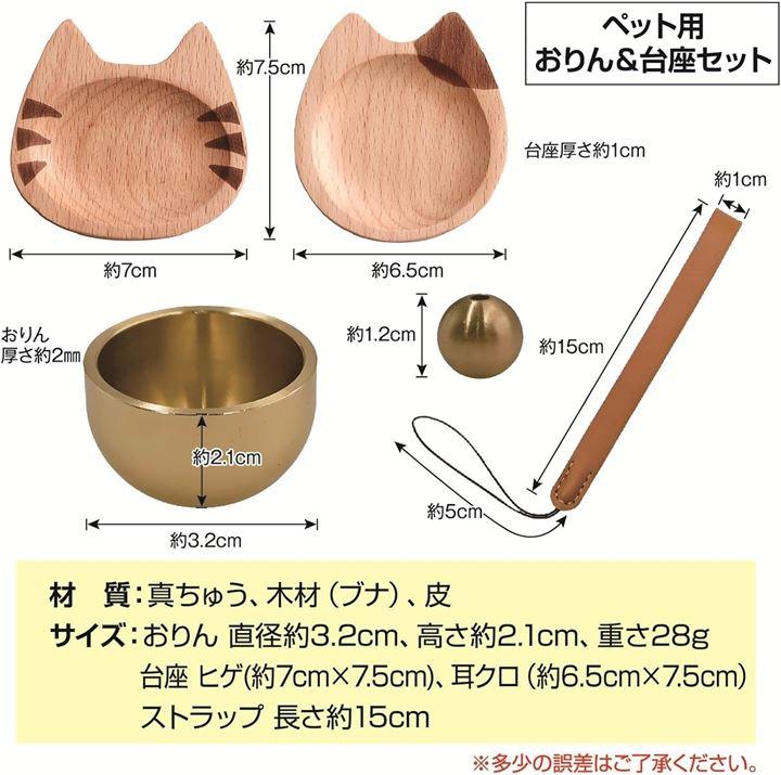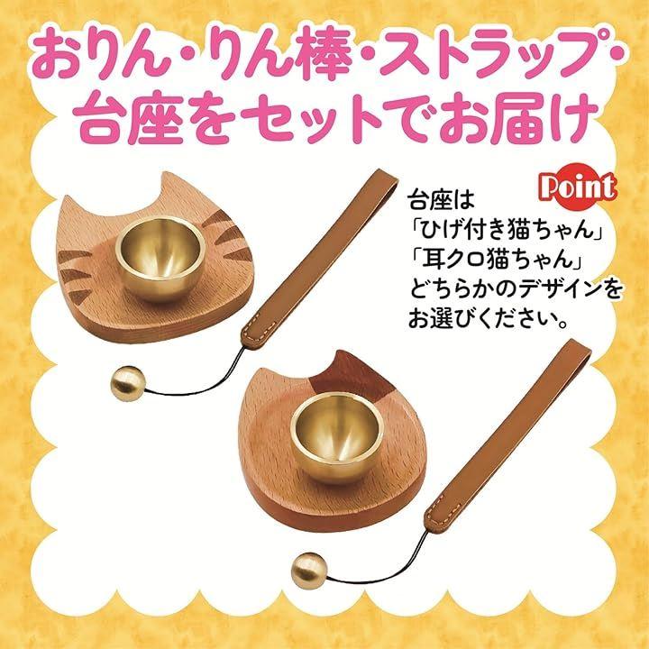 「サイズ」 耳黒の台座:約6.5cmx7.5cm、ヒゲの台座:約7cmx7.5cm おりん約3.2cmx2.1cm ストラップ約15cm りん玉約1.3cmx1.2cm 「素材」 真ちゅう、木材(ブナ)、皮 「商品重量」1セット約57g 「内容」 猫型台座、おりん、ストラップ型りん玉