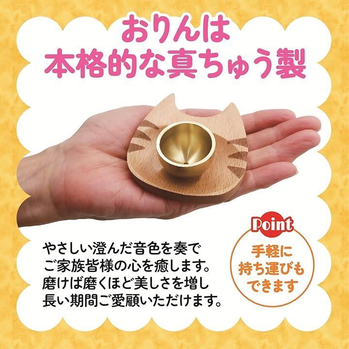 ストラップ付きの丸いフォルムのりん棒と、おりん、ブナ材を使用した猫型の台座をセットでお届けします。