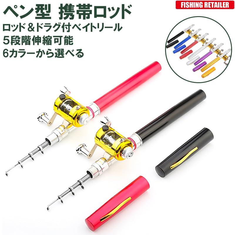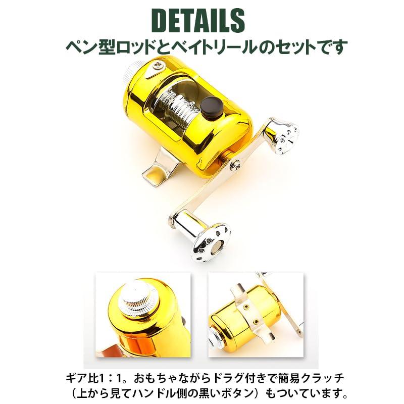 ペン型ロッドとベイトリールのセットです 外観は小型でかわいいペン形携帯しやすく、いつでもどこでも釣りを楽しめます ギア比1:1おもちゃながらドラグ付きで簡易クラッチ(上から見てハンドル側の黒いボタン)もついています 5段階伸縮可能 長さ調節約20~100cm 収納時は約20cm、伸ばすと約100cmになります キャップ部分にはクリップ付 ポケットなどに固定して簡単かつコンパクトに携帯できて便利です穴釣りやテトラの探り釣りなどに最適なセットです ペン型デザインを採用 ペン型設計を採用していて、コンパクトで軽量なボディはポケット、グローブボックス、グリーフケース、 バックパックなどに収まります 幅広いシーンに対応 砂浜の投げ釣り、川釣り、湖釣り、海釣りなど様々なシーンで大活躍です 【対象魚種】ハヤ・ハゼ・豆アジ・サヨリ・アイナメ・カサゴ釣り、ボートや氷穴からのワカサギ釣り、 川でのザリガニ・テナガエビ釣りなどアウトドアの簡易なフィッシングをお子様やお友達と楽しむのにぴったりです カラーバリエーション A.ゴールド B.パープル C.ブルー D.シルバー E.ブラック F.レッド もっとお買い得を目指しました グローバル販売向けの商品を直輸入安価にご提供が可能になりました 厳重な商品検品、ラベルや商品パッケージ製作など 日本国内販売向けの製造はとてもコストUPに繋がります それらを省いて大幅なコストダウンを実現しました セット内容 ペン型ロッド×1 ベイトリール× 1 サイズ(約): ロッド最大引張り長さ:100cm ロッド最小収縮寸法:20cm ベイトリール:幅6cm×縦7cm 重量(約):ロッド:52g ベイトリール:30g 素材:ロッド:ガラス繊維+アルミニウム合金 ベイトリール:銅+アルミニウム合金 生産国:中国 実寸につき1~2cm程度の誤差がある場合がございます 傷、汚れなどが有る場合がございますアウトドアに使うものになりますのでご理解の上、ご注文お願いします 画像はサンプル(試作)の為、実際の色や仕様と異なる場合がございます