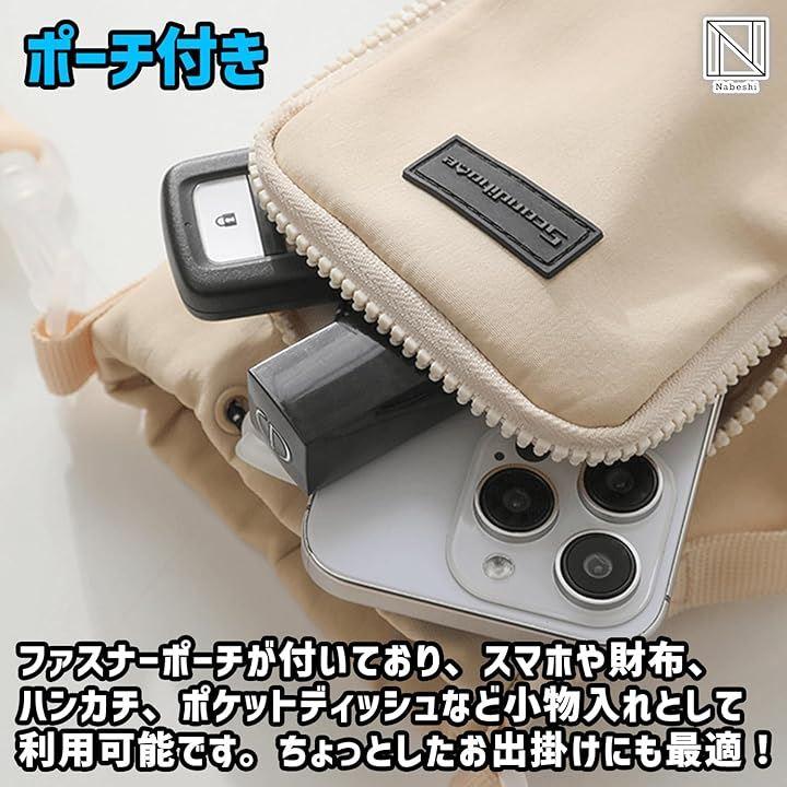 「ポーチ付き」ファスナーポーチが付いており、スマホや財布、ハンカチ、ポケットディッシュなど小物入れとして利用可能です。