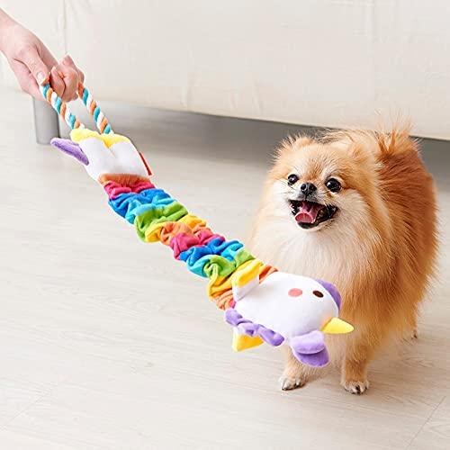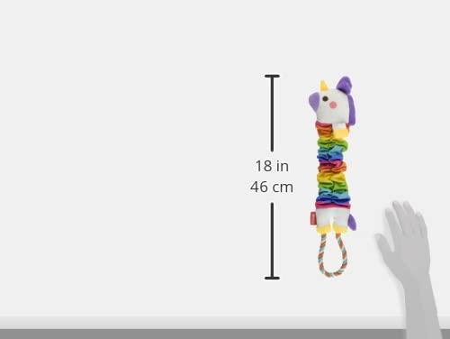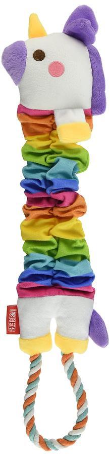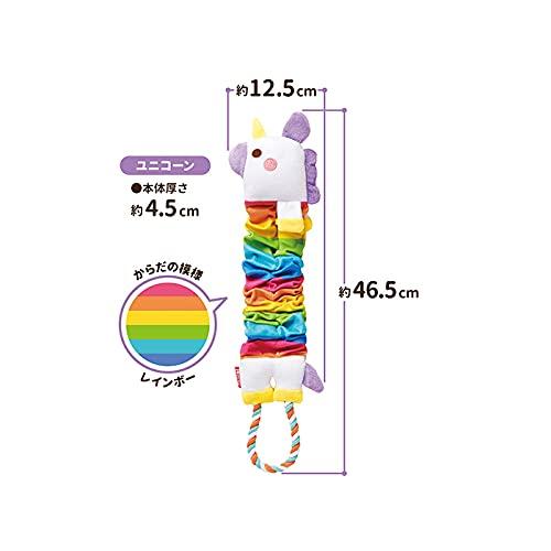 引っぱるとカラフルな体がのびる、ロングタイプのおもちゃ。体はゴム入りで、引っぱり合いや、長い体をくねくね動かして遊べます。顔部分はピーピー笛入り、足部分は引っぱり合いがしやすいロープ付きです。