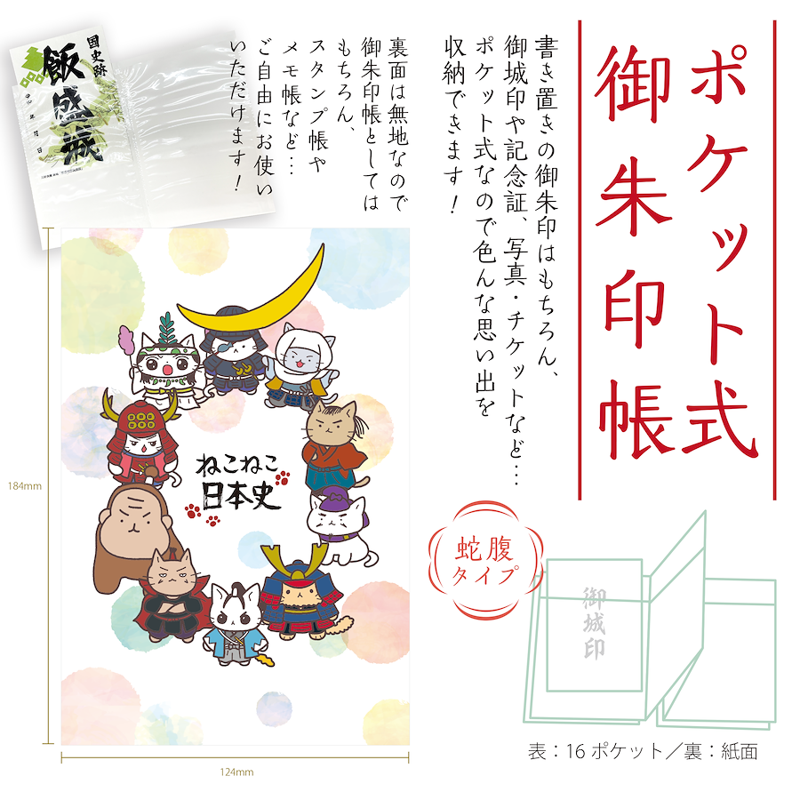 書き置きの御朱印はもちろん、御城印や記念証、写真・チケットなど…ポケット式なので色んな思い出を収納できます!裏面は無地なので御朱印帳としてはもちろん、スタンプ帳やメモ帳など…ご自由にお使いいただけます!「ねこねこ日本史」ファンの方、旅行好きな方へ贈り物としても最適です!