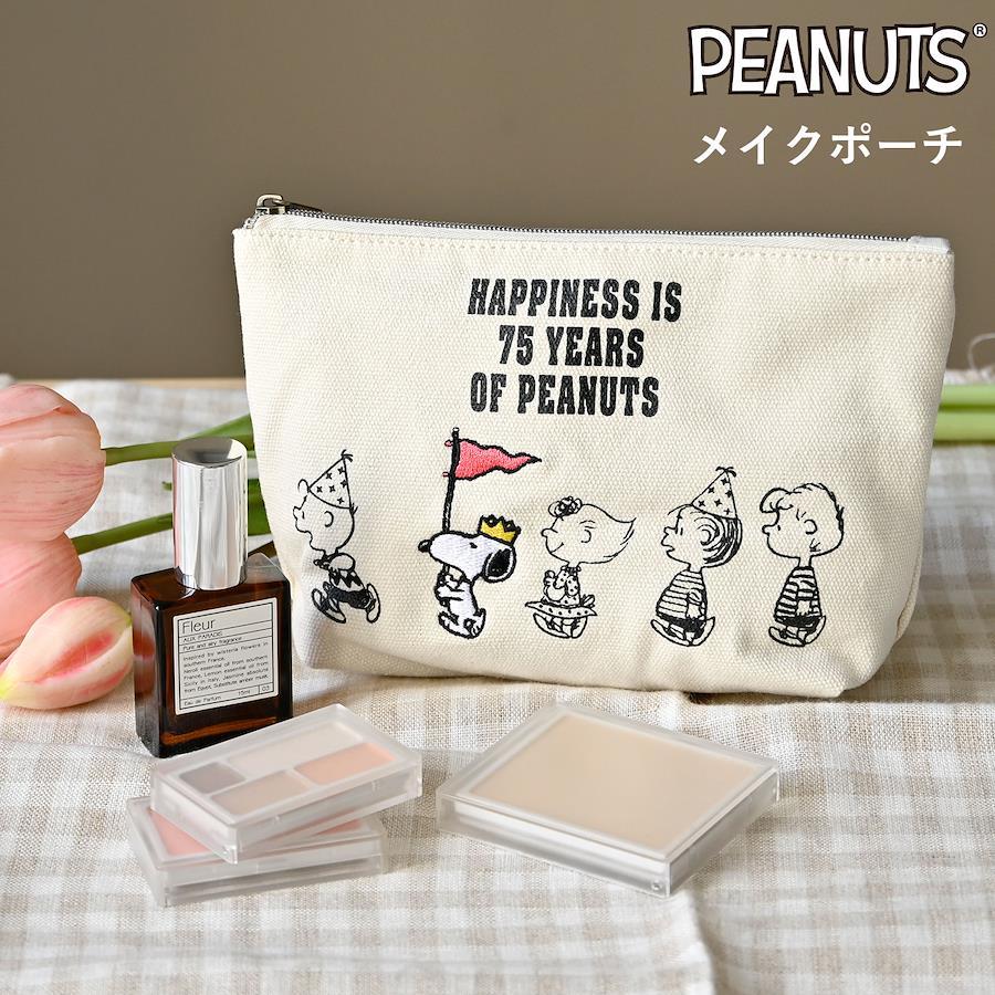 【化粧ポーチ】75周年のアニバーサリー柄が可愛い!スヌーピーたちのキャンバスミニポーチ。コスメポーチにちょうどいいマチつきの小さめサイズです。ちょっとしたプレゼントにも◎