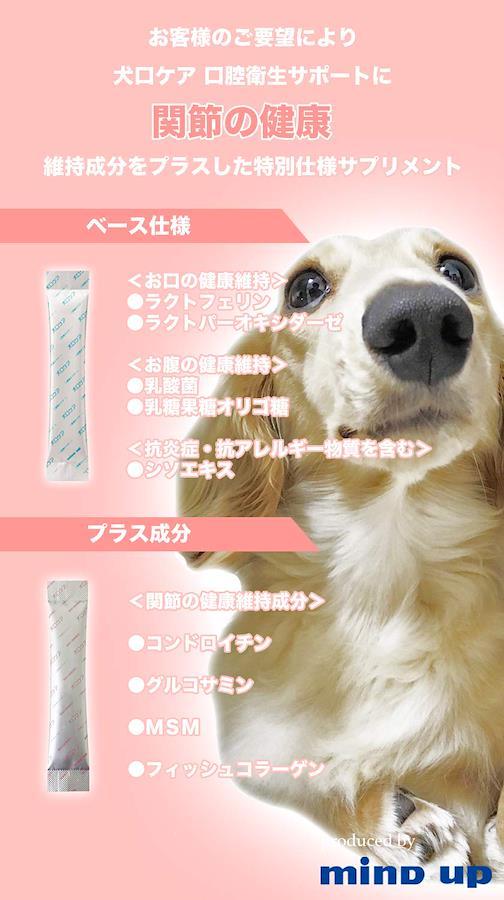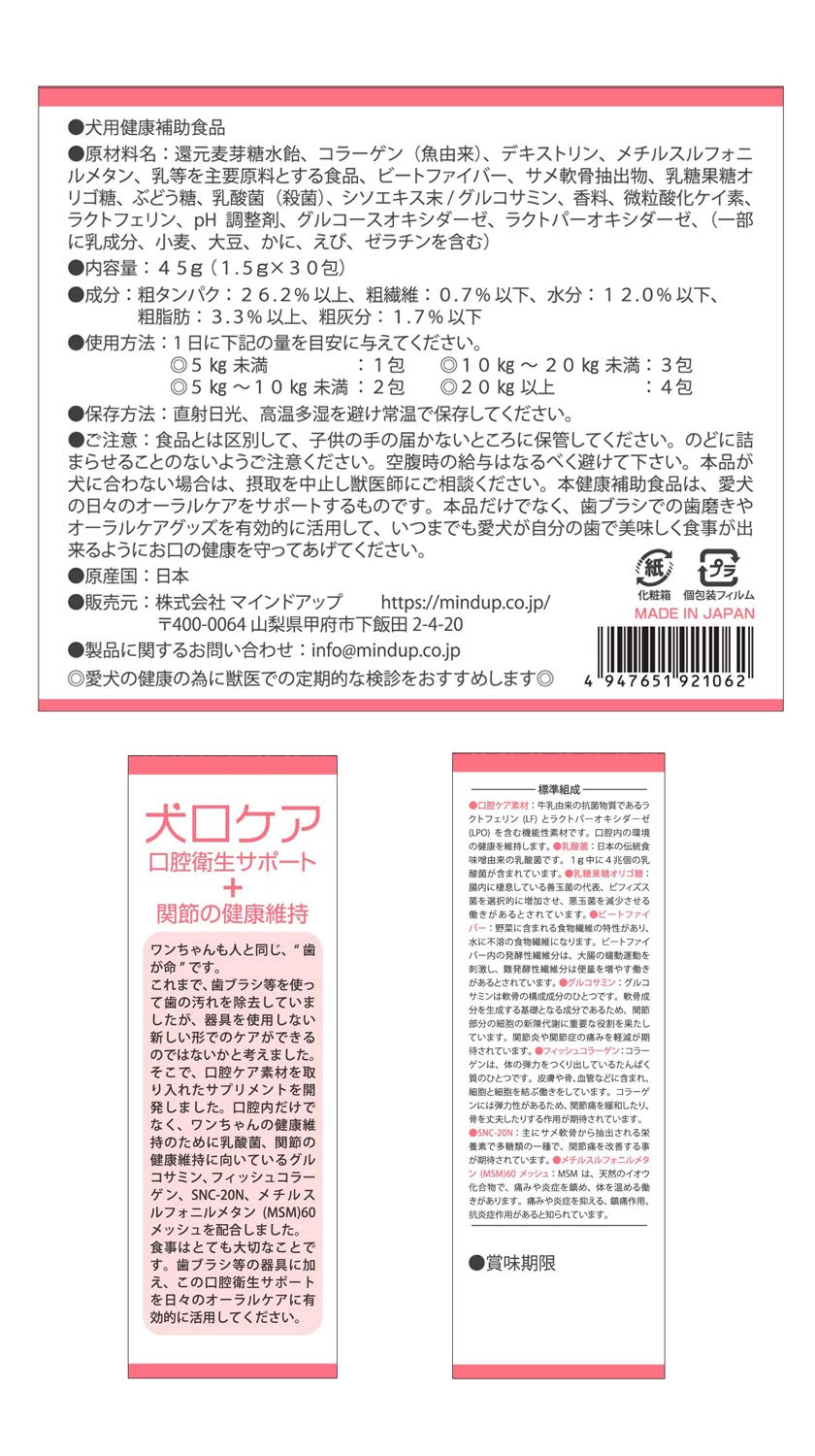 従来のオーラルヘルスパウダー 口腔衛生サポートにジョイントケア(関節の健康維持)成分をたっぷりとプラスしました。関節の健康維持、オーラルケア、お腹サポートにお役立てください。/■主なケア成分●口腔ケア素材 ラクトフェリン+ラクトパーオキシダーゼ ●乳酸菌 日本の伝統食味噌由来の乳酸菌です。●乳糖果糖オリゴ糖 ●コンドロイチン ●グルコサミン ●MSM ●フィッシュコラーゲン 原材料詳細は製品裏面に記載(画像参照)/■一般販売価格:4378円(税込) ■内容量:1箱 1.5g×30包 ■原産国:日本/■成分:粗タンパク:26.2%以上、粗繊維:0.7%以下、水分:12.0%以下、粗脂肪:3.3%以上、粗灰分:1.7%以下/■使用目安 1日あたり◎5kg未満:1包 ◎5kg~10kg:2包 ◎10kg~15kg:3包 ◎15kg以上:4包