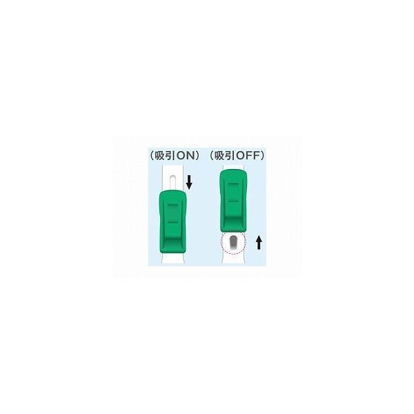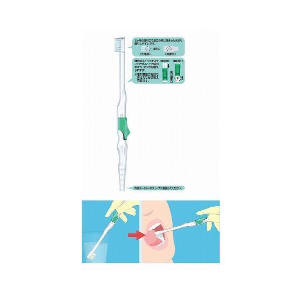医療現場から生まれました!汚れはしっかり清掃しながら、粘膜にはやさしい、やわらかめのブラシ!●持ち手部分に緑色の吸引オン・オフ切替えスイッチ付き。●吸引器接続タイプ。吸引チューブにしっかりフィットする波型形状なので抜けにくく、操作しやすいです。※内径5~8mmのチューブに接続してください。●2か所の吸引器でお口の奥に溜まった水分も吸引しやすいです。●ヘッドには清掃面と先端部にそれぞれ吸引口を設けています。吸引口は粘性のある汚れも吸引しやすいサイズに設計しています。●湾曲した形状の上あごや、頬の内側にも清掃面が沿いやすいです。●口腔内の奥に溜まった水分は先端部の吸引口で、清掃時の汚れた水分は清掃面の吸引口で素早く吸引することにより、誤嚥のリスクを低減できます。●片手で吸引と歯みがき、吸引と口腔清掃の操作が同時に可能になることで、安全性、簡便性が高くなります。●ヘッドは口腔内に挿入しやすい小さめサイズです。●柄は吸引物が見えやすい半透明です。