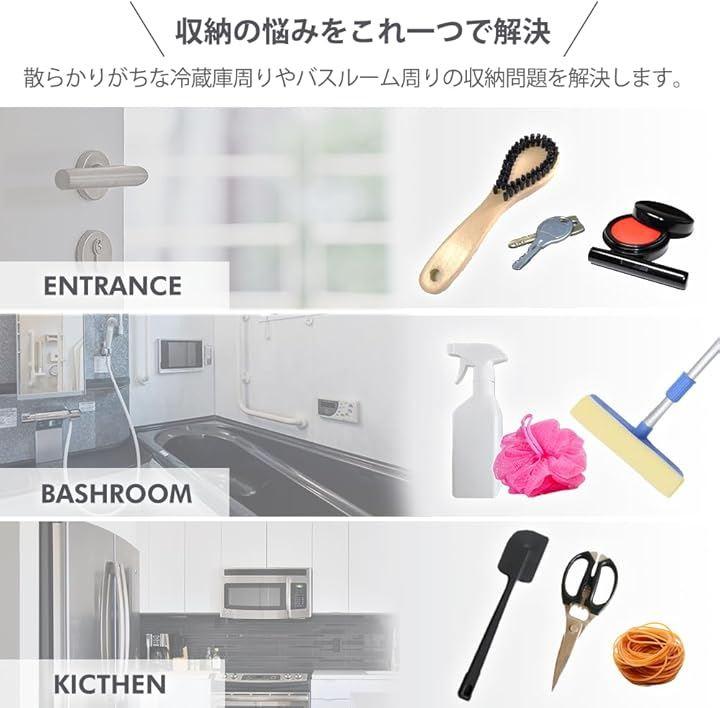 「マルチに使えるラック」 冷蔵庫サイドにスパイスや調味料を、浴室ではボトル収納を、玄関では鍵やアルコールスプレーなど多用途に。