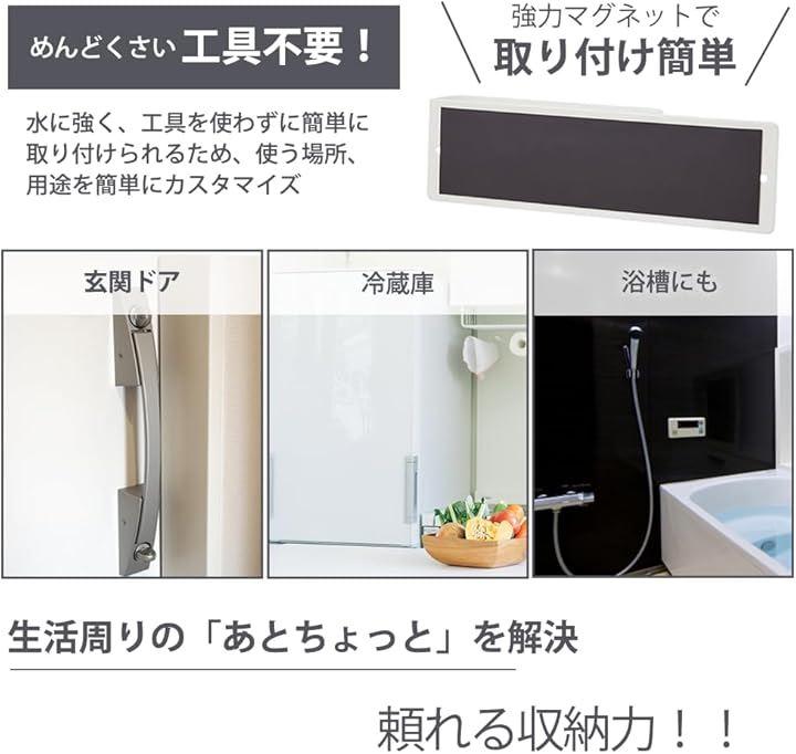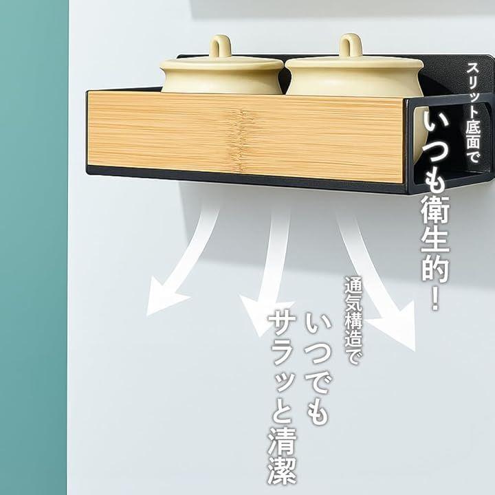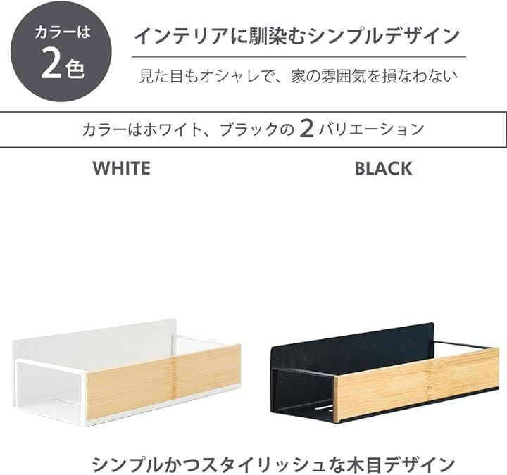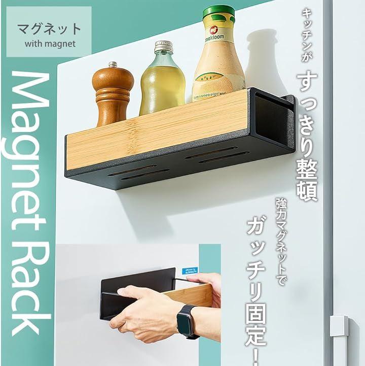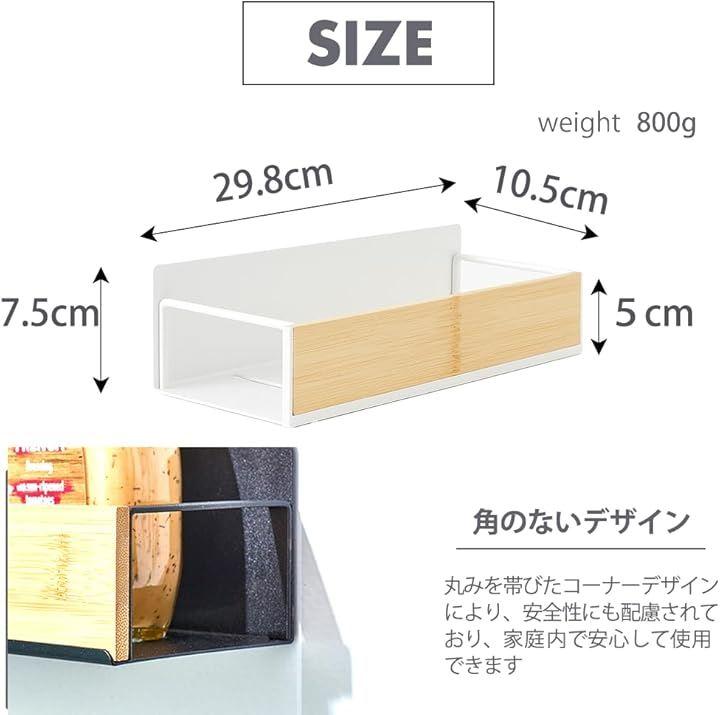 「商品仕様」 項目 内容 サイズ 幅29.8cm x 奥行10.5cm x 高さ7.5cm(内寸高さ5cm) 重量 約800g カラー ブラック / ホワイト 素材 スチール(粉体塗装)・竹集成材 耐荷重(目安) 約2kg 取り付け方式 背面マグネット式(強力タイプ) 用途例 冷蔵庫横、玄関ドア、浴室壁など 特徴 通気スリット構造・工具不要