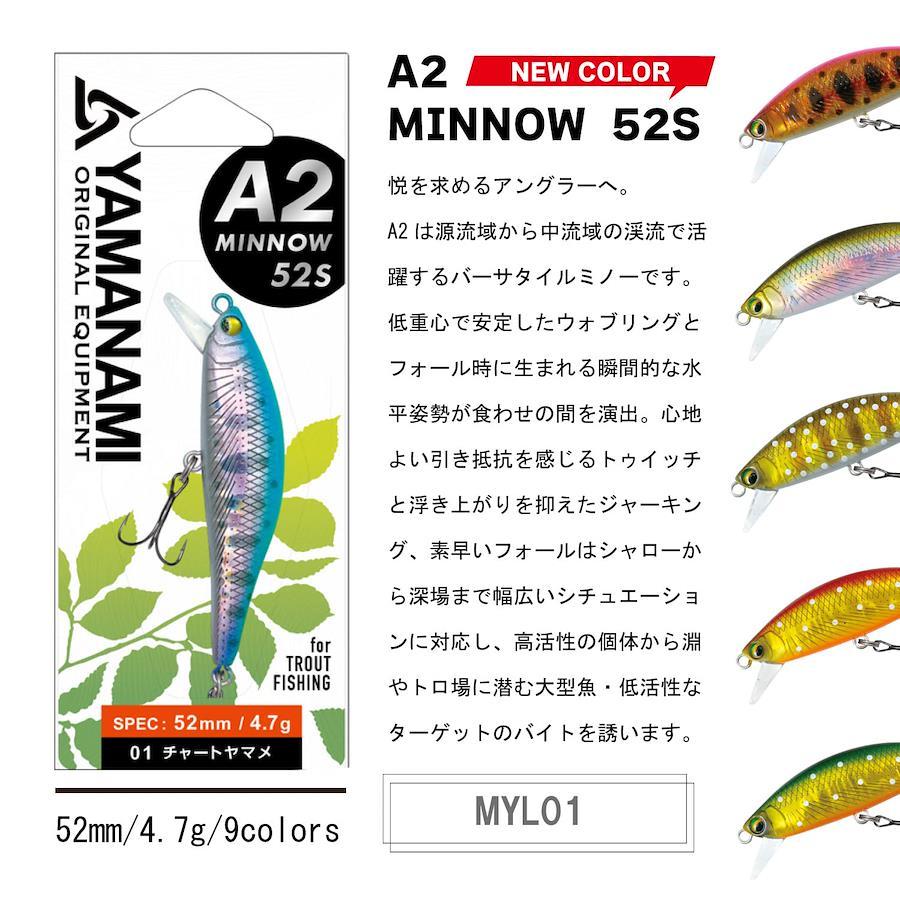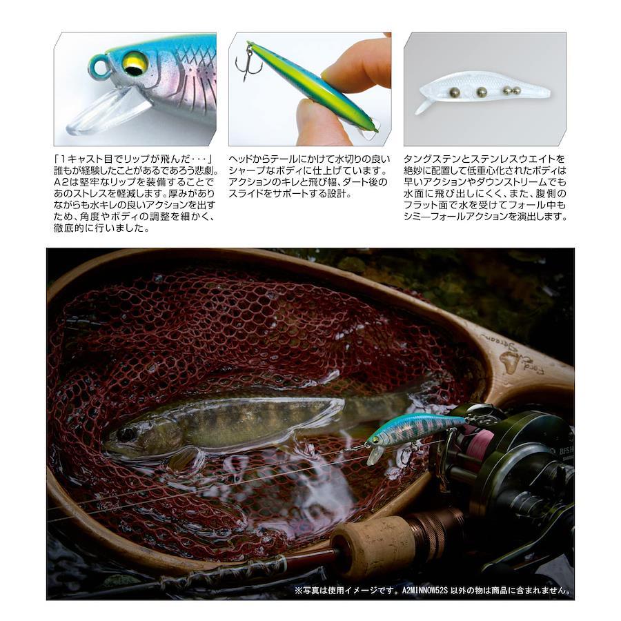 MYL01エーツーミノー52S!!“悦”を求めるアングラーへ。A2は源流域から中流域の渓流で活躍するバーサタイルミノーです。低重心で安定したウォブリングとフォール時に生まれる瞬間的な水平姿勢が食わせの間を演出。心地よい引き抵抗を感じるトゥイッチと浮き上がりを抑えたジャーキング、素早いフォールはシャローから深場まで幅広いシュチュエーションに対応し、高活性の個体から淵やトロ場に潜む大型魚・低活性なターゲットのバイトを誘います。