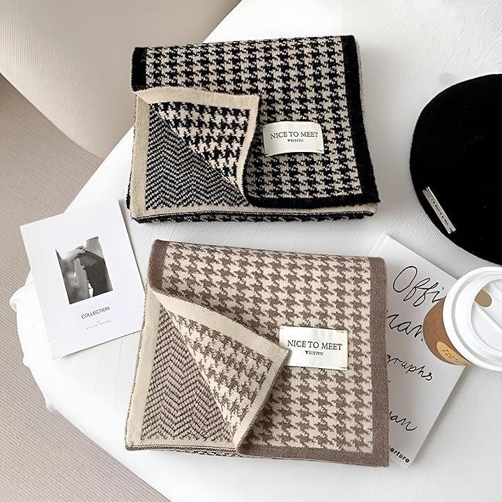 柔らかいポリエステル素材で肌触りが良く、リブ編みと千鳥格子デザインがスタイリッシュで、ブラックやベージュの2カラー展開。
