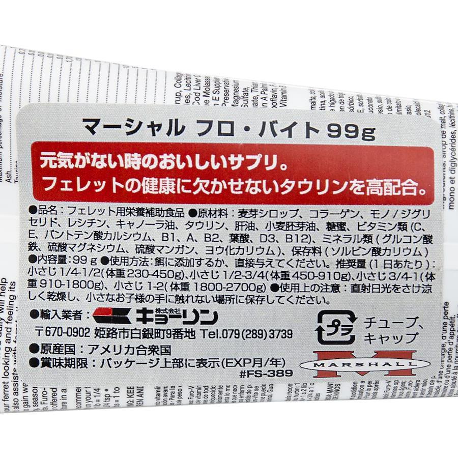 おいしく栄養補給!カロリーやビタミンを補給できる、フェレットのための補助食品です。全て天然のビタミンを使用したペーストですフェレットの食欲増進や、しつけのごほうびにもつかえる美味しさです。 マーシャル フロ・バイト 99g 対象 フェレット 機能 栄養補助食品 特長 ●ペット用フェレットのパイオニア、マーシャル社製品です。●天然ビタミンを冷却圧縮して作られており、ビタミンを多く含むフェレットの為の完全な補助栄養剤です。 ●高カロリーなので食欲のないフェレットの食欲増進や、しつけ用にもお勧めです。 ●病気や手術後のフェレットや、毎日のフードだけでは必要な栄養素が欠けがちな、栄養補給が必要なフェレットにもおすすめです。 ●全てのライフステージのフェレットに与えられます。 内容量 99g 原材料 モルトシロップ、コラーゲン、動物性油脂、レシチン、菜種油、タウリン、タラの肝油、小麦胚芽油、廃糖蜜、ビタミンC、ビタミンEサプリメント、保存料(ソルビン酸カリウム)、グルコン酸鉄、硫酸マグネシウム、硫酸マンガン、パントテン酸カルシウム、塩酸チアミン、ビタミンA、ヨウ化カリウム、リボフラビン、ビタミン