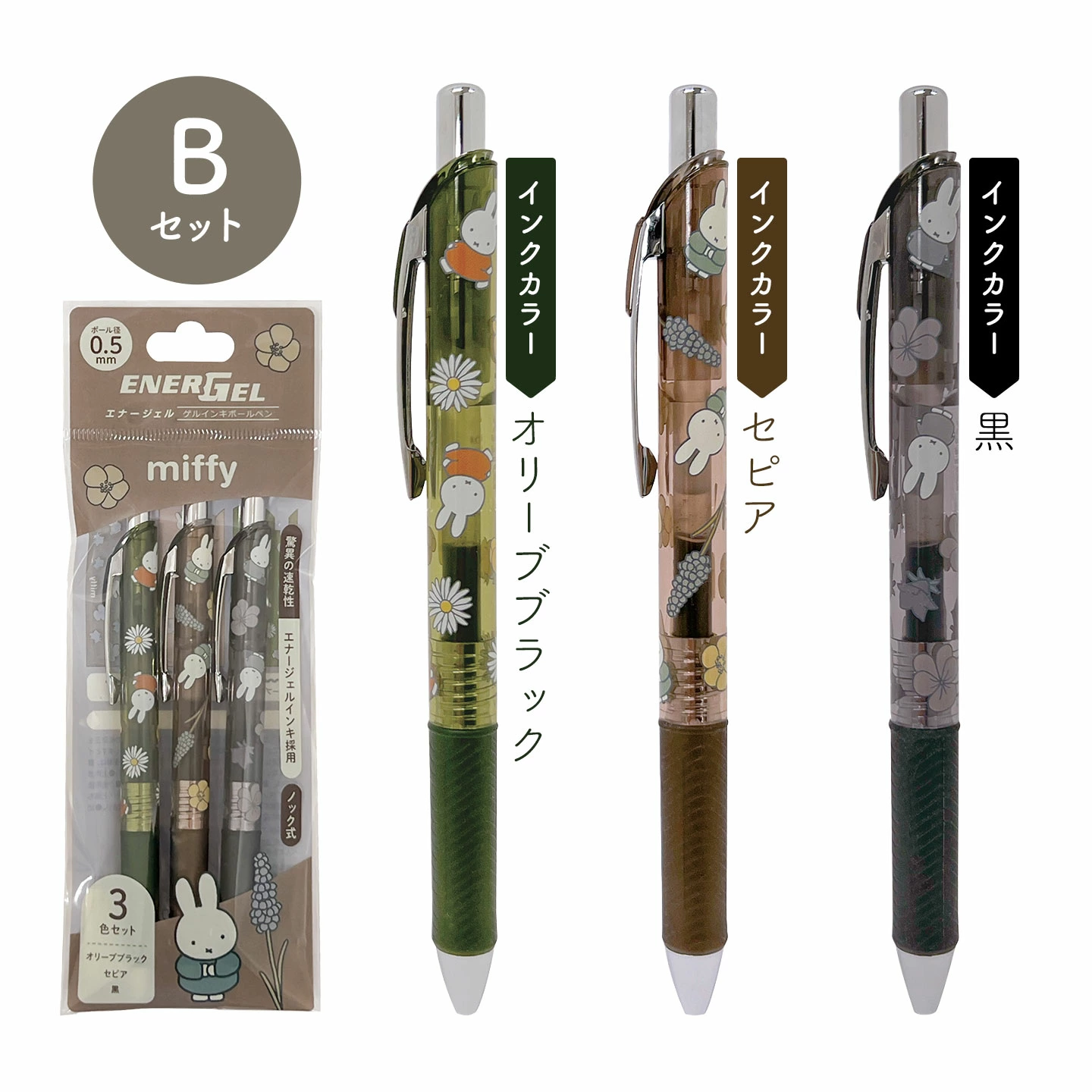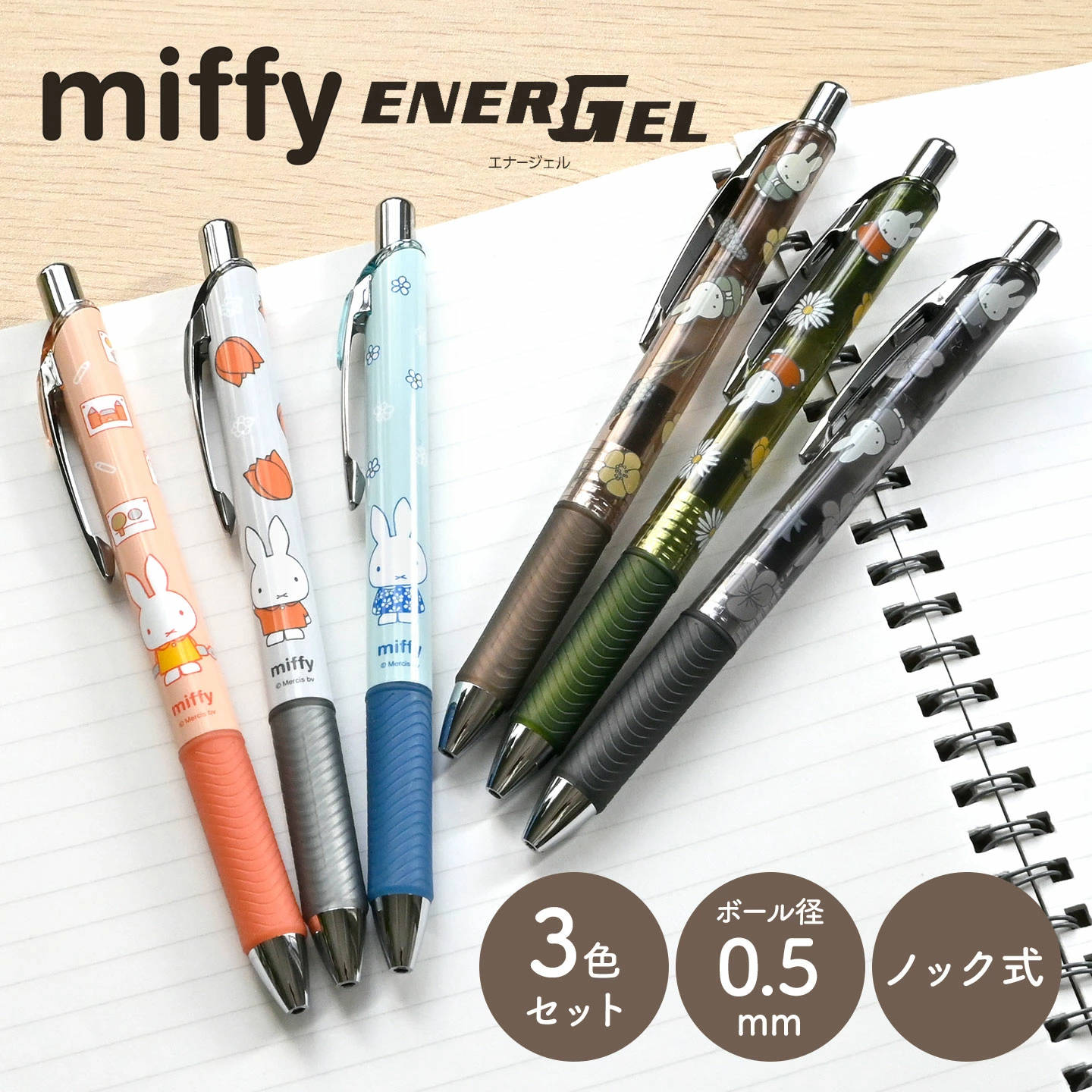 【エナージェル3色セット】濃くなめらかな書き心地と、速乾性のインキを搭載したストレスフリーなボールペン「エナージェル」がかわいいミッフィーデザインで登場。スタンダードな黒と、ブラックの代わりにも使いやすい2色を組み合わせた3色セットです。大人も使いやすいシンプルなデザインのノックボールペン式で、学生さんはもちろん社会人のお仕事用にもおすすめです。