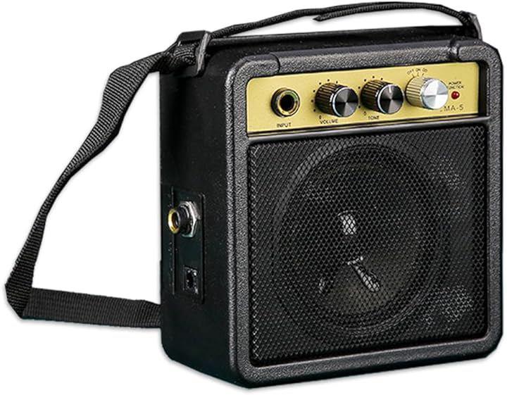 「商品内容」5Wミニギターアンプ カラー:ブラック サイズ:12cmx6cmx12cm 出力(サイド):6.35mmジャック 入力(フロント):6.35mmジャック 電力:9V電池/DC9V *電池およびアダプターは付属しません。