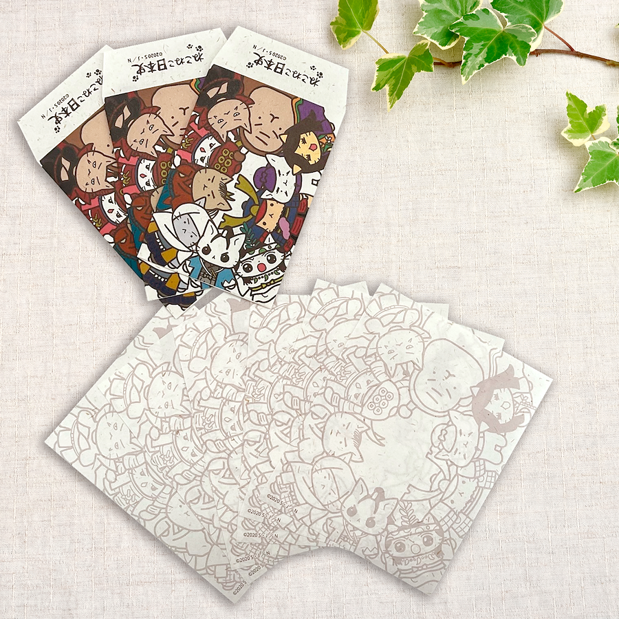 東北コットンCoCとは、東日本大震災の津波により、稲作が困難になった農地で綿(コットン)を栽培し、収穫後に残る廃棄されるはずの「茎」から採った繊維と森林認証パルプを原料に生産された紙です。繊維が漉き込まれていて、味わいのある風合いの紙に「ねこねこ日本史」キャラクターを印刷しました。