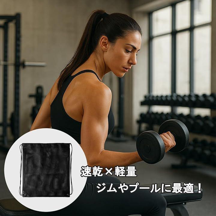 「通気性抜群のメッシュ素材」 全面メッシュ構造で湿気を逃がしやすく、濡れたタオルやウェアもムレにくい。ジムやプール後の持ち運びに最適です。