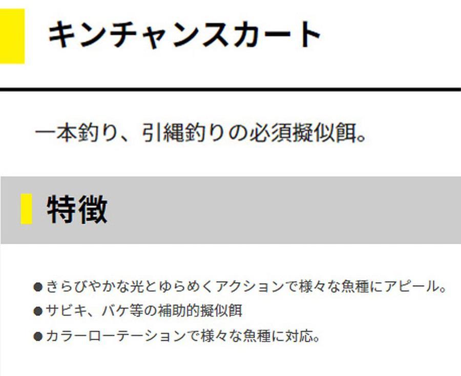一本釣り、引縄釣りの必須擬似餌 ●きらびやかな光とゆらめくアクションで様々な魚種にアピール。●サビキ、バケ等の補助的擬似餌●カラーローテーションで様々な魚種に対応。