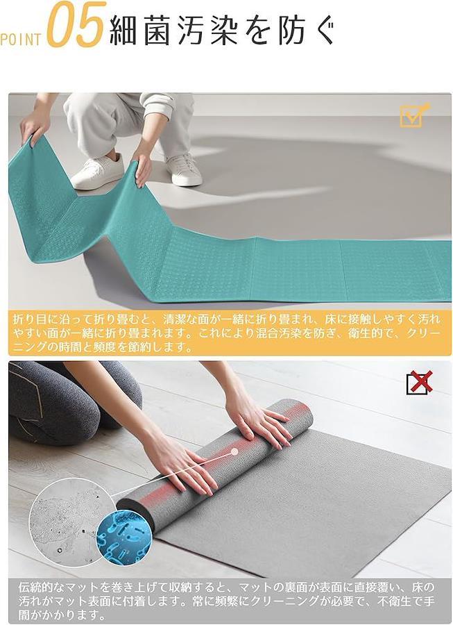 「細菌汚染を防ぐ」細菌汚染を防ぎ、従来の丸めたヨガマットよりも頻繁に掃除する手間が省けます。