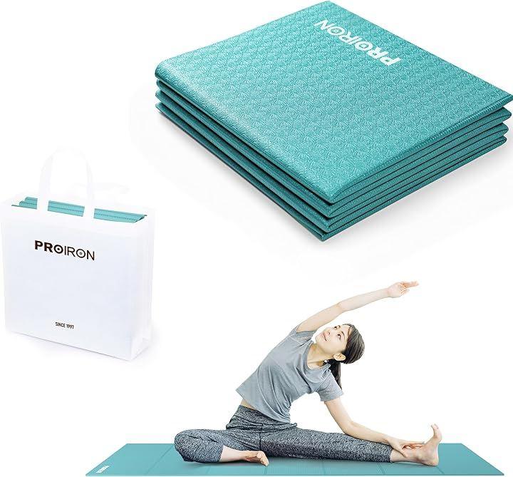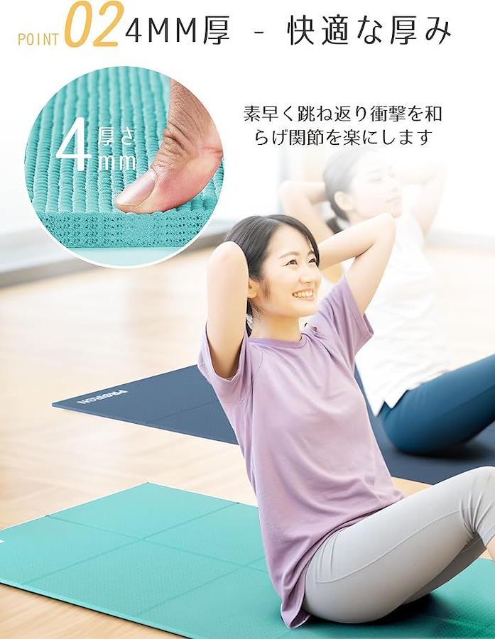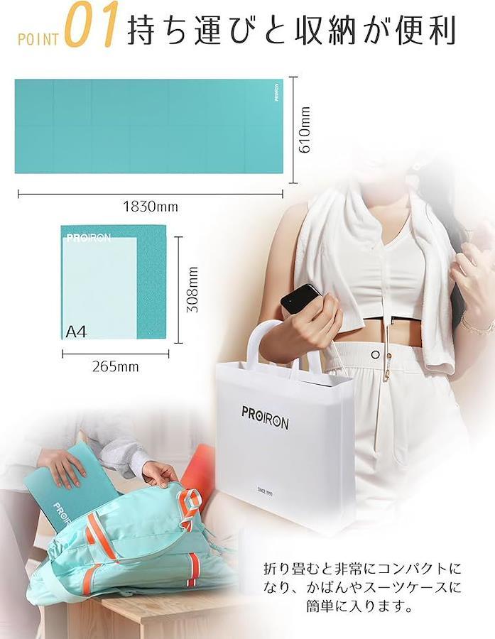 「折りたたみヨガマット」このヨガマットは折りたたむ前のサイズが183x61cm、折りたたんだ後は30.5x26.5x6cmになります。