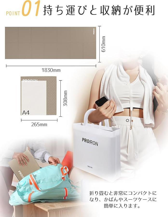 「折りたたみヨガマット」このヨガマットは折りたたむ前のサイズが183x61cm、折りたたんだ後は30.5x26.5x6cmになります。