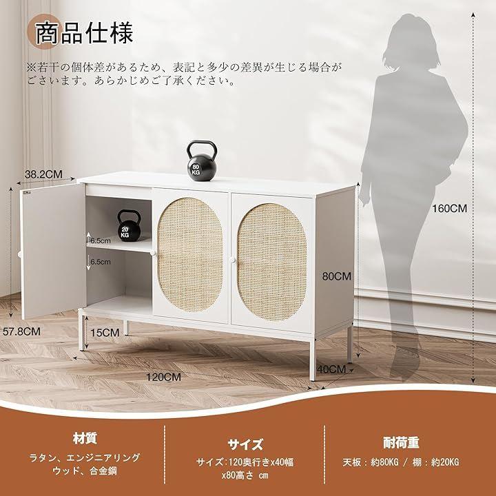 「商品仕様」*本体サイズ:幅120x奥行40x高さ80(cm)*個体差により若干の差異あり*梱包サイズ:約幅131x奥行47x高さ15.5(cm)*材質:天然ラタン+MFD天板+スチールパイプ*本体重量:約26kg*耐荷重:天板:約80kg|底板:約30kg|可動棚板:約20kg*総重量(梱包材含む):約27.1kg*「備考」*お客様組み立て品