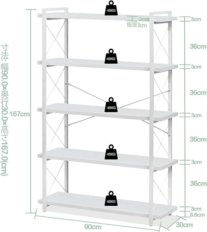 3cm厚さの棚板は耐荷重が各45kgで、重さがある生活用品を置いても大丈夫です。