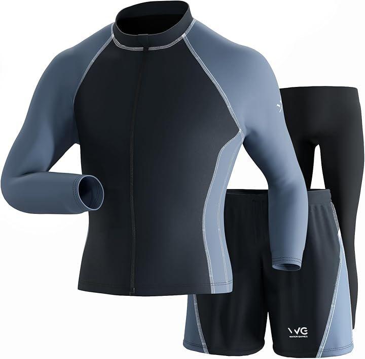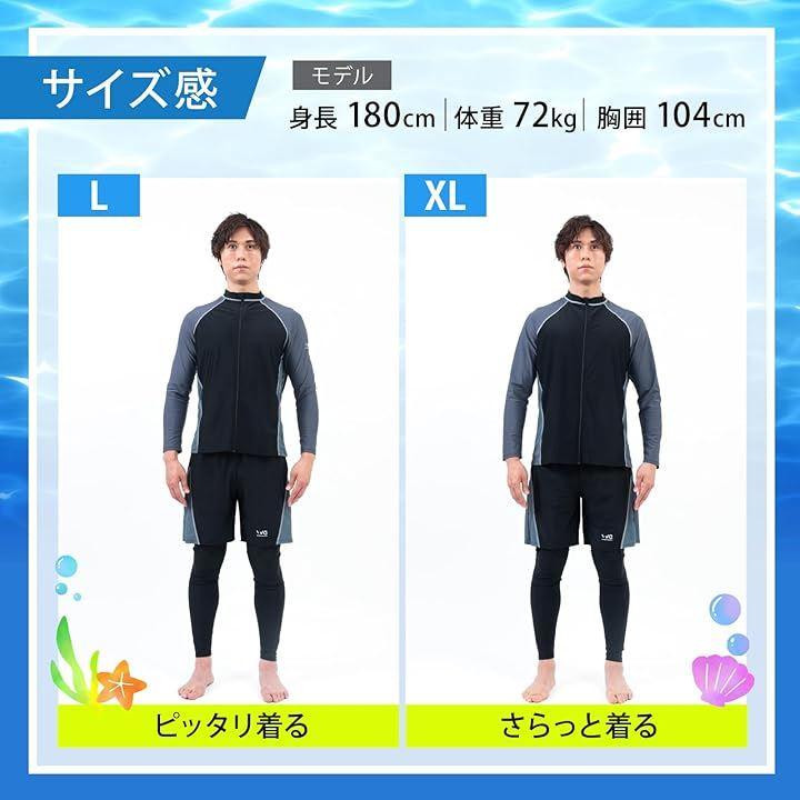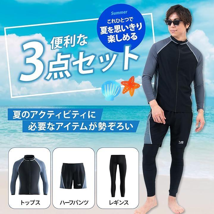 「セット内容&着用サイズ」長袖ラッシュガード、ハーフパンツ、レギンスの3点セット。