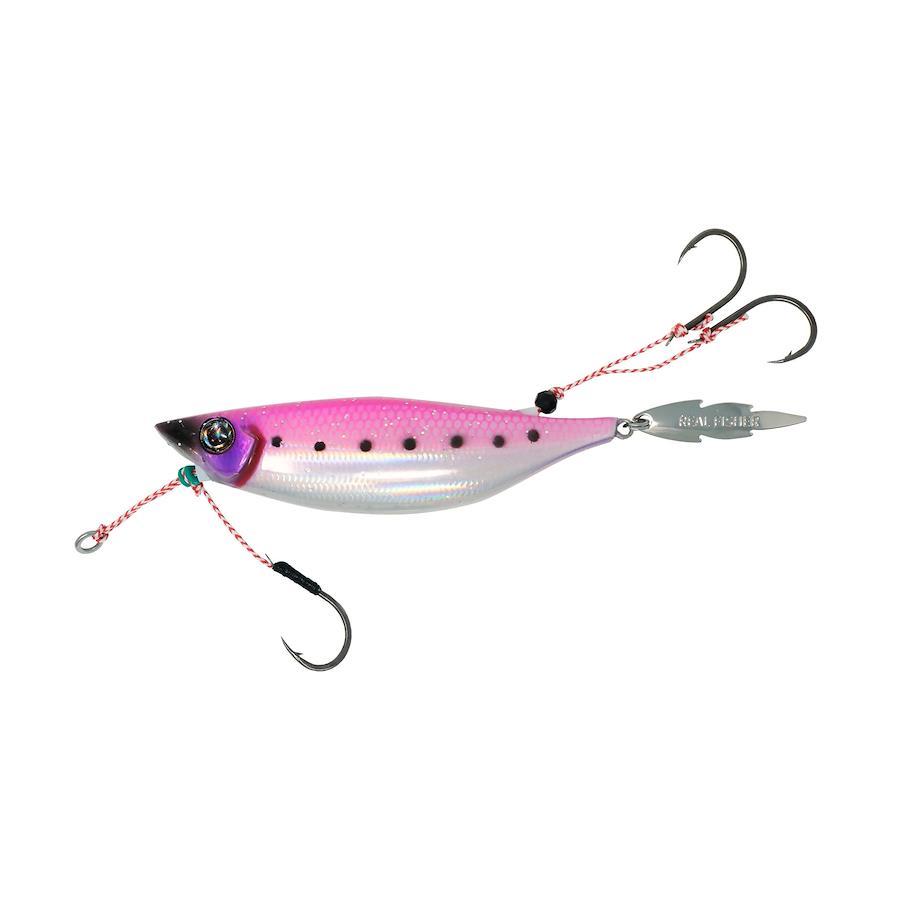 船長が作り出すこだわりの新感覚スロージグ ●あじごスローはタイラバとジグの融合。つまりタイラバの良い部分とジグの良い部分を兼ね備えている。●ただ巻きではローリング&ダートアクション、シャくると反転し派手なスライドアクションを演出。この独特な動きに反応する魚種は、かなり多い。●根魚はもちろん、真鯛、青物。その他、ヒラメやマゴチなどのフラットフィッシュまで幅広く狙える。●カラーは6色。フルシルバーにはケイムラが施されており、シマグローは文字通りグロータイプとなっている。●イワシブルーとイワシピンクはラメ入り、アジゴグリーンとアジゴレッドにはアジの胸ビレ模様入り。●テール部のファイヤーブレードはREALFISHERネーム入りのオリジナルで作り上げたパーツになりますリアルフィッシャー REAL FISHER あじごスロー 80g (メタルジグ ジギング)※画像はシリーズ代表の商品を使用しております。悪しからずご了承下さい。※ホログラムの仕様は、製造時期により異なる場合があります。≪リアルフィッシャー REAL FISHER メタルジグ ジギング≫